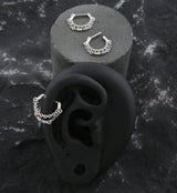 Hinged segment ring made from 316L stainless steel with a hoop design that has a dangling chain and a row of rainbow cz gems. Colors include: red, yellow, clear, green, aqua, amethyst. Size is 16G with an inner diameter size of either 5/16" (8mm) or 3/8" (10mm). The hinged design makes this piece easy to insert and remove. Sold individually (1pc).