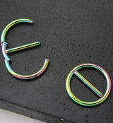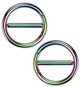 Keep it cool with this colorful hinged nipple clicker ring made from rainbow pvd on 316L stainless steel. The hinged design makes this piece easy to wear. The bar is 1/2" (12mm) in length with an inner diameter of 12mm, so make sure this will fit your nipple before purchase. Thickness is 14G. Sold in pairs. For healed piercings.