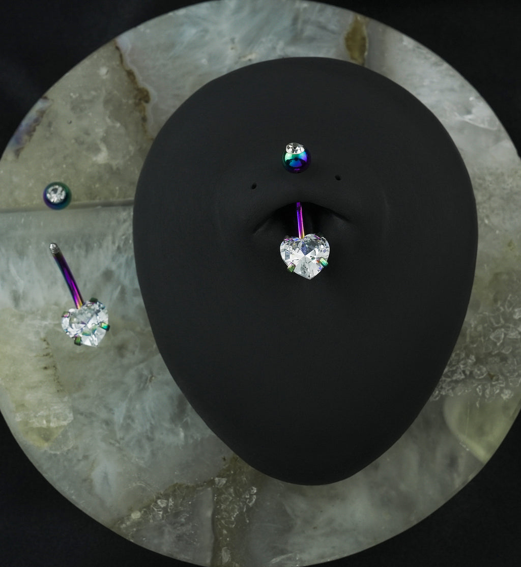 Fun belly button ring with a heart-shaped, clear, cz gemstone design. The barbell of this piece is made from rainbow pvd on 316L stainless steel and is a size 14G with a 3/8" (10mm) length. Add some colorful shine to your everyday look by adding this to your belly button collection! For healed piercings.