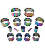 Add some color to your jewelry collection! These tunnels are made from rainbow pvd on 316L stainless steel and have a double flare style. Available in sizes 8G-1" (25mm). Sold in pairs (2 pcs). For healed lobes.