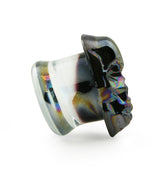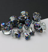 Colorful rainbow pyrex glass plugs with a spooky skull on the front. Choose your size! : 2G, 0G, 00G (10mm), 1/2 inch (12mm), 9/16 inch (14mm), 5/8 inch (16mm). Full length is 16mm with a wearable area of 9mm. Sold in pairs (2 pcs). For healed lobes/piercings.