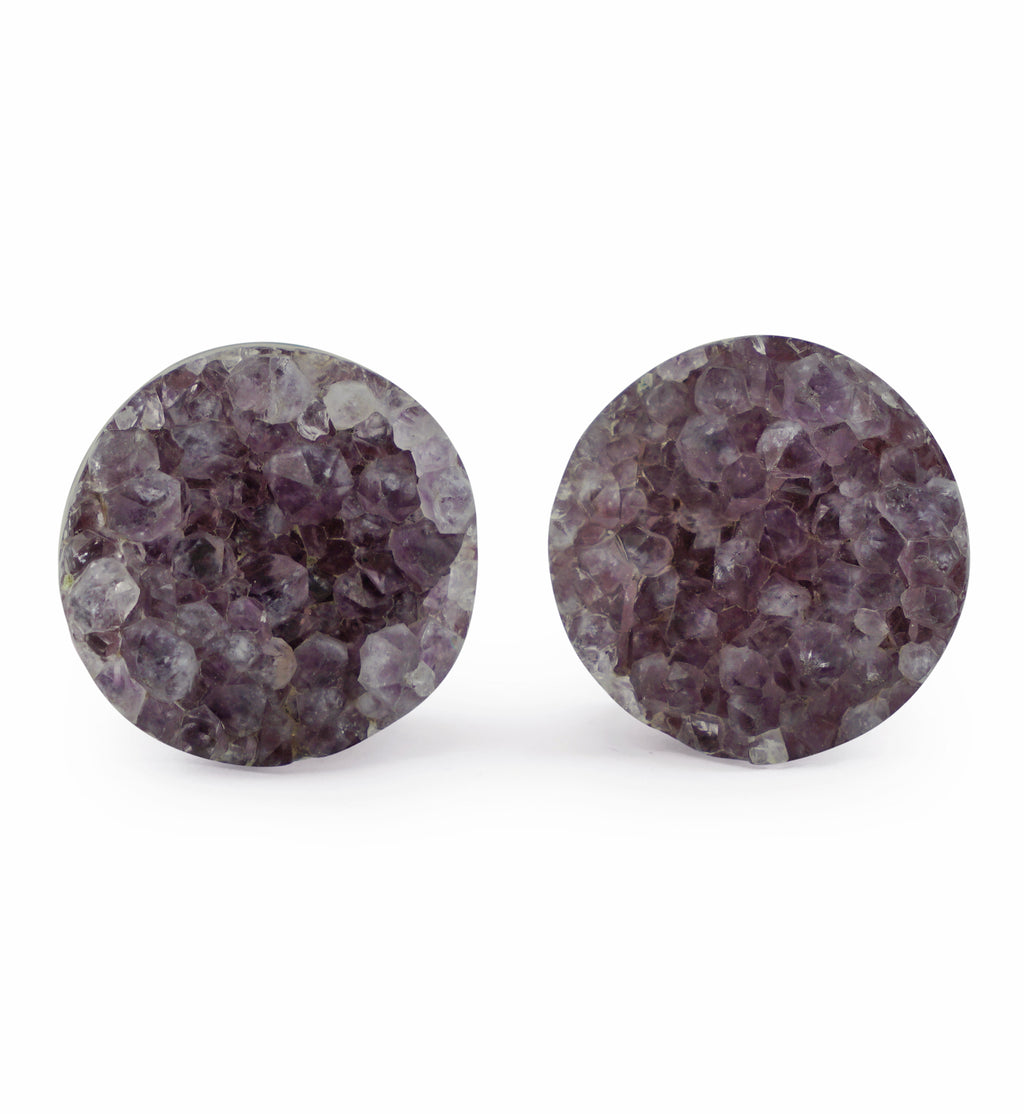 Handmade and sold in pairs (2pcs), these Raw Amethyst Plugs are a cool choice for those with stretched ears. Each plug is 100% unique, as they are made from raw amethyst stones. These 7/8" (22mm) double flare plugs have a wearable area of 10mm and a full length of 24mm for both. These are fragile so please handle with care!