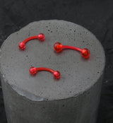 Red acrylic curved barbells with balls on the end. Externally threaded. Curved barbell. Size is 16G with a length of 5/16" (8mm). Will have 3mm balls. Sold individually (1pc). For healed piercings.