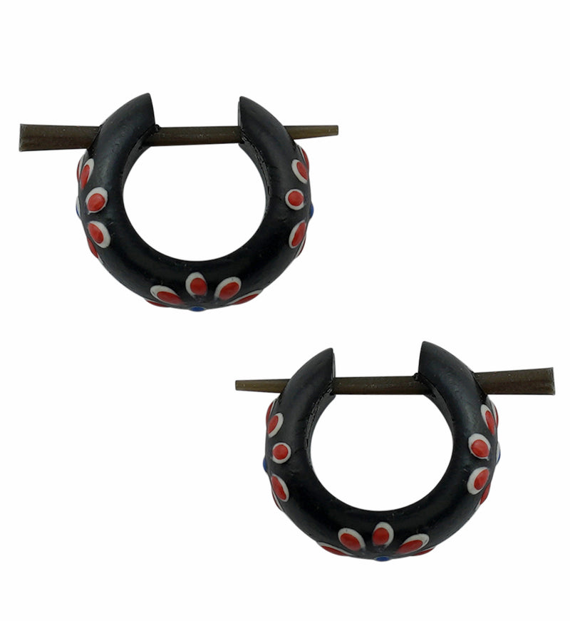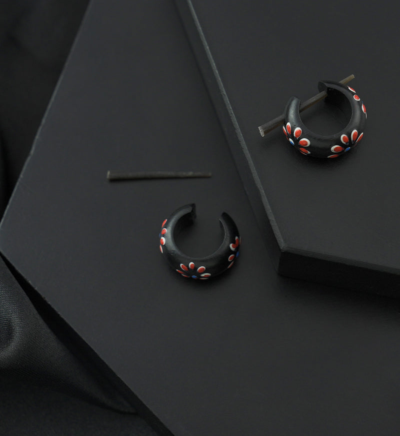 Hoop earrings made from dark narra wood with cute, red flowers throughout. These have a removable 16G bar and are easy to put in and remove. Small, lightweight and polished. Height: 14mm and width: 15mm. Sold in pairs (2pcs).
