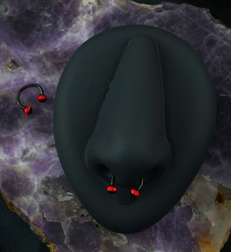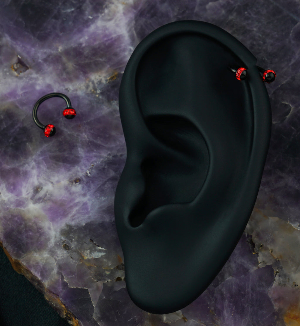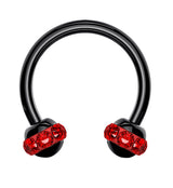 Add this Red Gem Orb Black Circular Barbell to your jewelry collection! This 16G circular barbell is made of black pvd on 316L stainless steel with externally threaded design for a comfortable and secure fit. Featuring stunning red CZ gems, this barbell is meant for healed piercings. Sold individually, add this unique piece to your collection today!