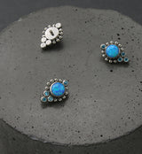 Royal looking internally threaded top piece made up of a synthetic blue opal gem and several, sparkling aqua cz gems. This piece is made from ASTM F136 titanium. Measures about 8.5mm x 6mm. Size is 16G. M0.9 threading. Sold individually (1pc).