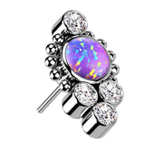 Regal looking threadless top piece made up of clear cz gems surrounding a purple synthetic opalite gem. This piece is made from ASTM F136 titanium. Approximately 7mm length. Pin length is 5mm. Sold individually.