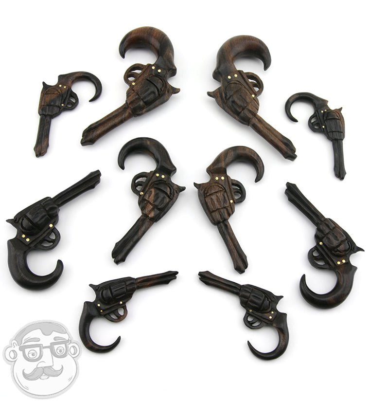 Sold in pairs, these Revolver Areng Wood Hangers bring a bold vibe to your healed lobes. Each piece is handmade and features a unique carved revolver design with natural variations in pattern and color. Available in sizes from 8G (3.2mm) up to 1/2" (12mm), these smooth, polished hangers are perfect for adding a fun edge—just don’t use them for stretching! Meant for healed lobes.