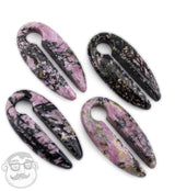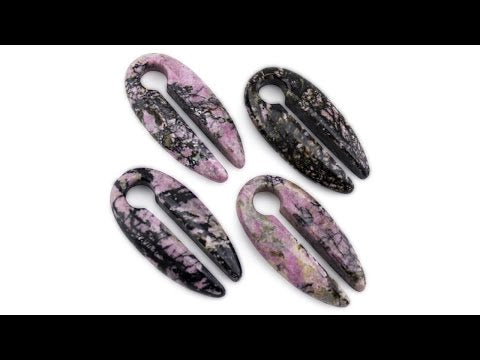 This pair of rhodonite stone keyhole ear weights is the perfect accent to any look. Crafted with natural rhodonite stone, these ear weights are hand made with a height of 60mm and width of 30mm, and are designed to fit anyone with a piercing larger than 1/2" (13mm). Add a touch of elegance with these beautiful ear weights.