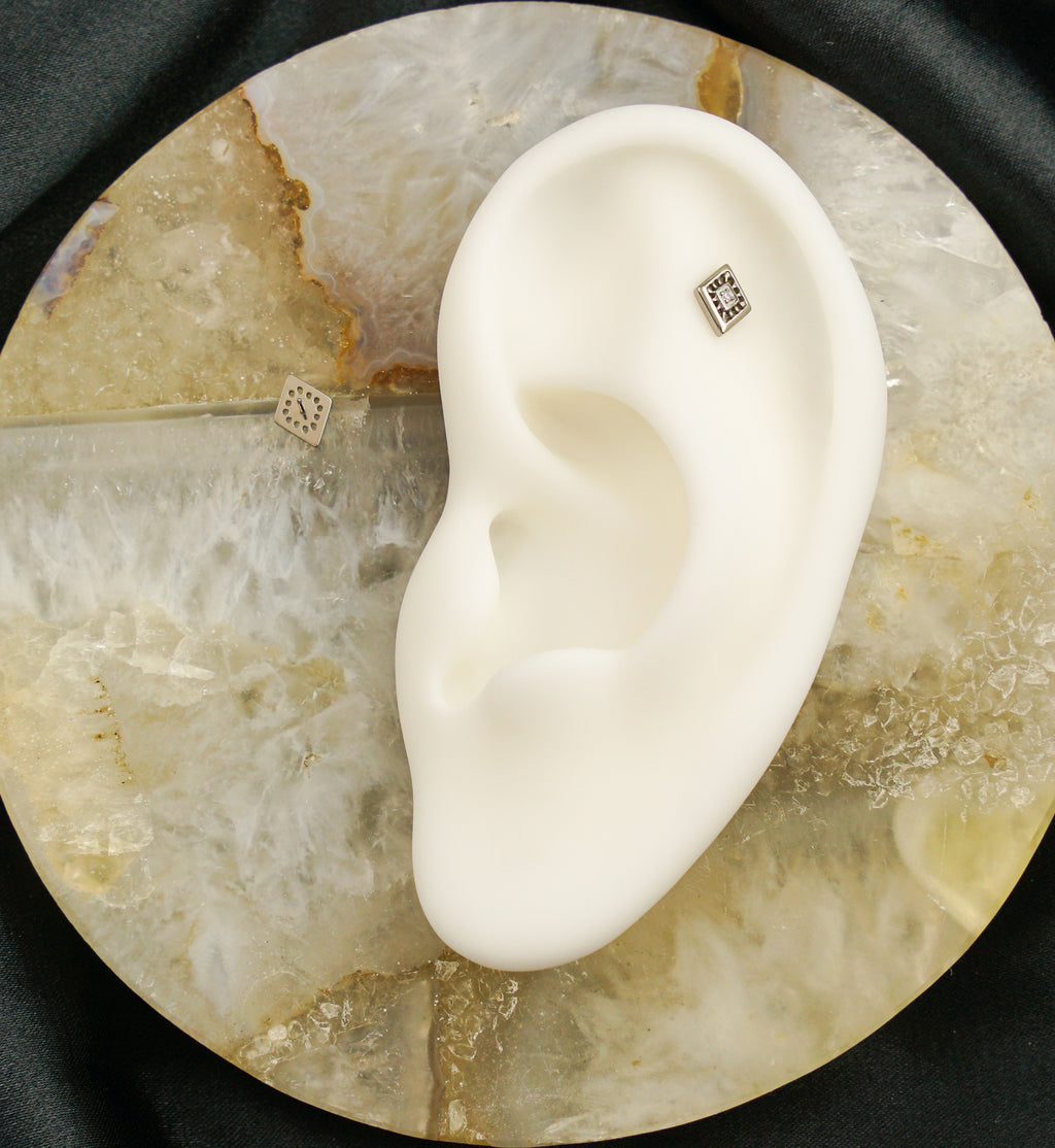 This threadless top piece has a diamond-shaped design that has cutouts and a centered, clear cz gem. Pin size is 25G so it fits most threadless tops. The top size is about 7mm x 6mm. It is made from ASTM F-136 titanium. Easy to put in and remove. Sold Individually - top only.