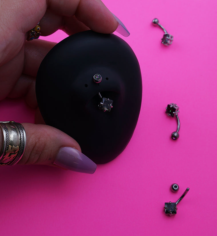 Show off your curves in the most stylish way with this diamond shaped brass prong black aurora CZ titanium belly button ring! Crafted of ASTM F-136 titanium and brass, the externally-threaded ring features two dazzling black aurora cubic zirconia gems, bezel set top size is 5mm and diamond shaped, prong set bottom size is 8mm. Please note that the barbell is titanium and the bottom gem is set in brass. Brass is not meant for long term wear, it may oxidize under extreme moisture conditions. For healed piercings. Sold individually (1pc).