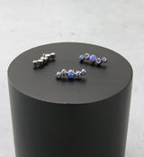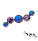 Beautiful internally threaded top piece that has an oscillating amethyst purple cz and purple opalite design. Made from ASTM F-136 titanium and five bezel set cz gems and synthetic opal gems. Measures about 11.5mm x 3.3mm. M0.9 threading. Fits 16G internally threaded posts. Sold individually (top piece only).