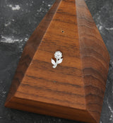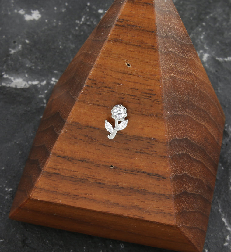 Threadless top piece that has a rose and leaves design that is filled with clear cz gems. One round cz gem in the flower and two marquise cz gems as the leaves. Made from ASTM F-136 titanium. Measures about 8.5mm x 5.5mm. 25G pin. Fits most threadless posts. Sold individually (top piece only).