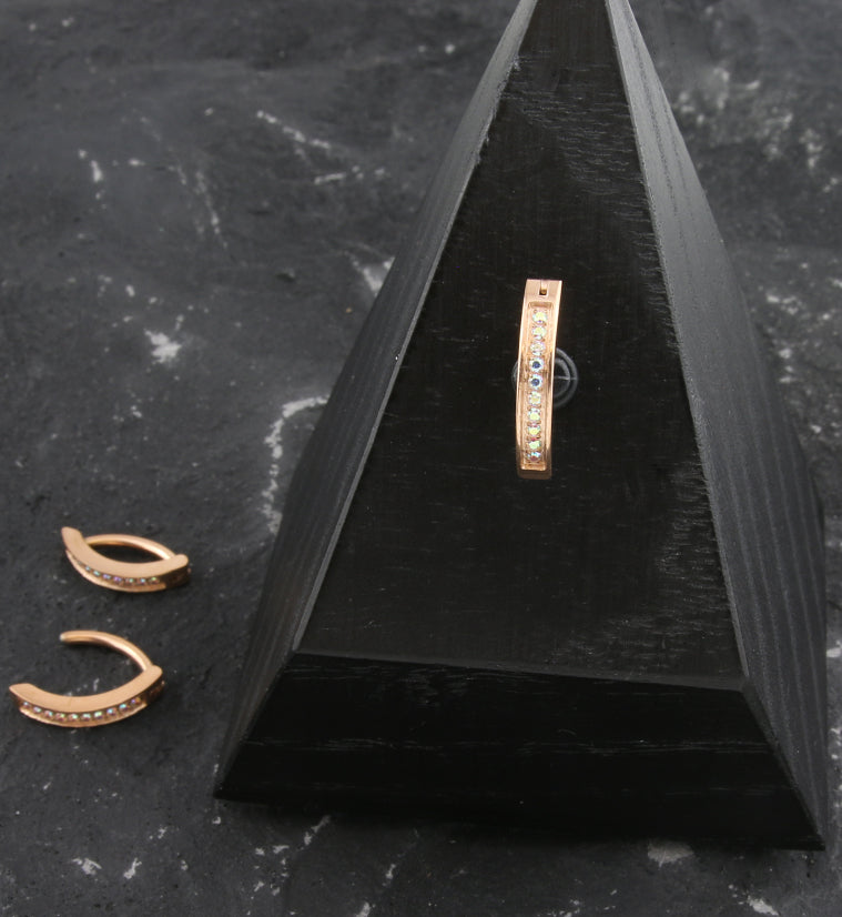 Sparkly belly button ring with a hinged design that showcases a sleek bar design with a line of rainbow aurora cz gems going down the middle. Size is 14G with a 3/8" (10mm) or 1/2" (12mm) barbell length. It is made from rose gold pvd on 316L stainless steel with a hinged design. The hinged design makes this piece easy to insert and click closed. Sold individually (1 pc).