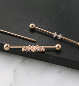 Fall in love with this beaded heart industrial barbell! The 14g straight barbell is constructed from rose gold pvd on 316L stainless steel and two 5mm balls. Easy external threading. The heart in the middle is surrounded by sparkling cz gems and a triple beaded design. Sold individually. Intended for healed piercings only.