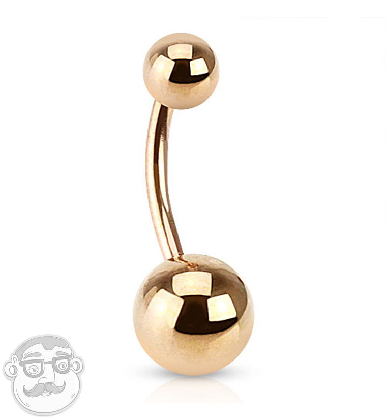This belly button ring features a stunning rose gold PVD coating on surgical 316L stainless steel. Available in 16G and 14G sizes, it is externally threaded and comes in varying lengths and ball sizes for a customized fit. Perfect for healed piercings.