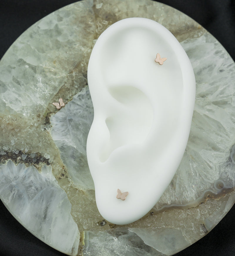 Threadless top piece that has a butterfly design that has rounded edges, making it look like a bubble butterfly shape. Created from rose gold pvd on ASTM F-136 titanium. The top design measures 4mm. Cute piece for your cartilage or tragus piercing! Sold individually.