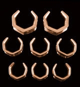 These Rose Gold PVD Hex Saddles are crafted from durable 316L stainless steel with a luxurious rose gold PVD finish. Sold in pairs, with a 7mm - 8mm wearable area, they are perfect for ear stretching and wearing heavy ear weights/earrings, providing support to evenly distribute weight.