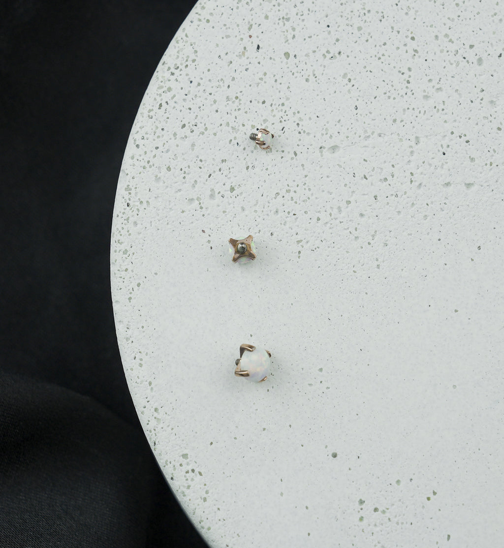 Internally threaded top piece that has a prong set, synthetic white opalite gem on top. Made from rose gold pvd on ASTM F-136 titanium. Size is 16G with M0.9mm threading. Choose your gem size from 2mm, 3mm, or 4mm. Amazing top piece for your cartilage or tragus piercing! Sold individually.