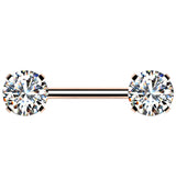 Get glitzy with our rose gold double CZ barbell! The 14g straight barbell features 316L stainless steel construction with rose gold PVD coating. 1/2” barbell length and threadless posts ensure a solid fit. Clear cubic zirconia ends are set with prongs and measure 6mm total. Ideal for healed piercings only.