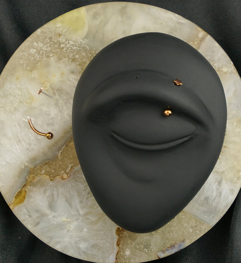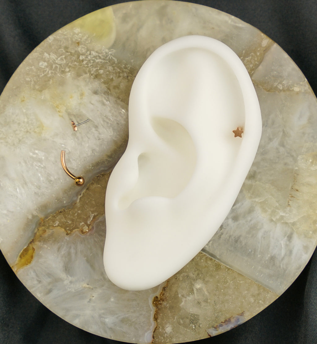 Curved barbells decorated with a mini, star design on top. The top piece has a threadless design that makes it easy to insert and remove. The top design measures 3mm. Made from rose gold pvd on durable ASTM F-136 titanium with an inner length of 5/16" (8mm) and a 16G size. Complete with a 3mm ball on the end. Sold individually. Pretty jewelry choice for eyebrow or rook piercings!