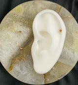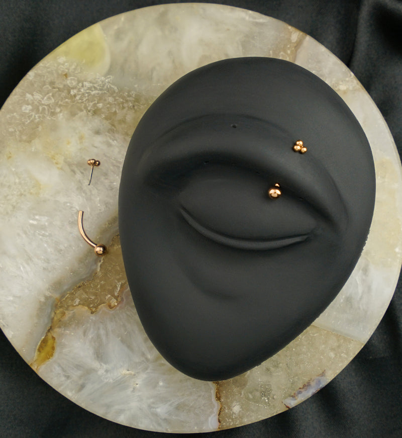 Pretty, curved barbells decorated with a small, triple bead design on top. The top piece has a threadless design that makes it effortless to insert and remove. The top design measures 3mm. Made from rose gold pvd on ASTM F-136 titanium with an inner length of 5/16" (8mm) and a 16G size. Complete with a 3mm ball on the bottom. Sold individually. Golden jewelry piece for your eyebrow or rook piercings!