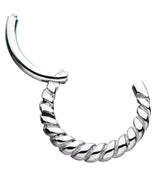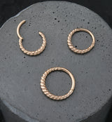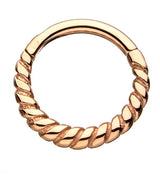 Twisted hinged segment ring design. Great option for septum or cartilage piercings! Hinged design for easy opening and closing. Made from rose gold pvd on 316L stainless steel. Choose from 16G and 18G. Choose your diameter size from 5/16" (8mm) and 3/8" (10mm). For healed piercings. Sold individually.