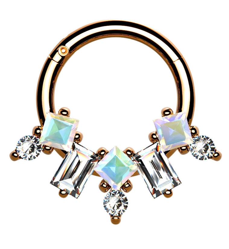 This Rose Gold PVD Vane CZ Hinged Segment Ring has a stunning design and is made of durable rose gold pvd on 316L stainless steel. It features a secure hinged design for easy and comfortable wear. With a 16G size and clear and Rainbow Aurora CZ gems, it's a sparkling choice for healed septum or cartilage piercings.