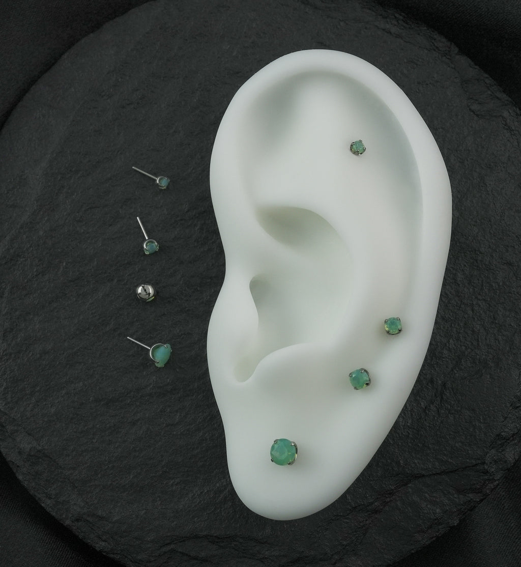 This threadless top is created from ASTM F136 Titanium and comes in a variety of gem sizes, including 2mm, 2.5mm, 3mm, and 4mm. The synthetic green opal has a soft green color and adds a fun pop of color to your look. Sold individually and fits most threadless posts.