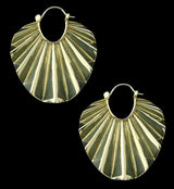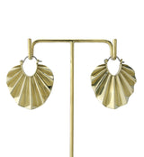 Golden brass hangers/earrings with rounded shape and a folded, sun ray design. Size is 18G with measurements of 44mm x 37mm. Each earring weighs about 18 grams. Made from brass with a ASTM F-136 titanium clasp. Sold in pairs (2 pieces).