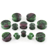 Sold in pairs (2 pieces) Sizes: 1/2" - 1 Inch Double flares Ruby zoisite stone NOTICE: Pattern & color will be unique for each plug We do our best to provide you a matching pair Wearable area: 10mm - 11mm