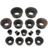 Handcrafted mayan flare tunnel plugs made from areng wood with a puckered, furrow design. Cool pair to add to your plug collection! Each piece will be unique in color and pattern due to the nature of the wood. We will do our best to find you a matching pair. Available in sizes 00G (10mm) - 2" (51mm). For healed piercings/lobes. Sold in pairs (2pcs).