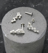 Internally threaded labret that consists of clear cz gems in the shape of the constellation of the Scorpio zodiac. Pin and base are made from 316L stainless steel and the constellation design is made from rhodium plated brass so it may tarnish over time if exposed to extreme moisture conditions. Choose your gauge size between 18G and 16g. Length is 5/16" (8mm). Constellation size is 14mm x 6mm. Flat back: 4mm. For healed piercings. Sold individually (1pc).
