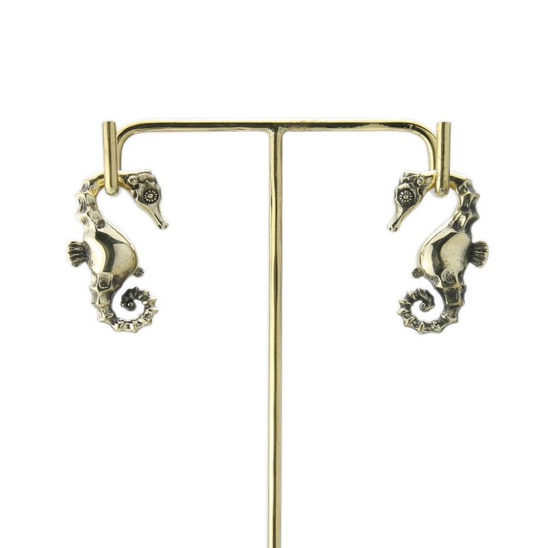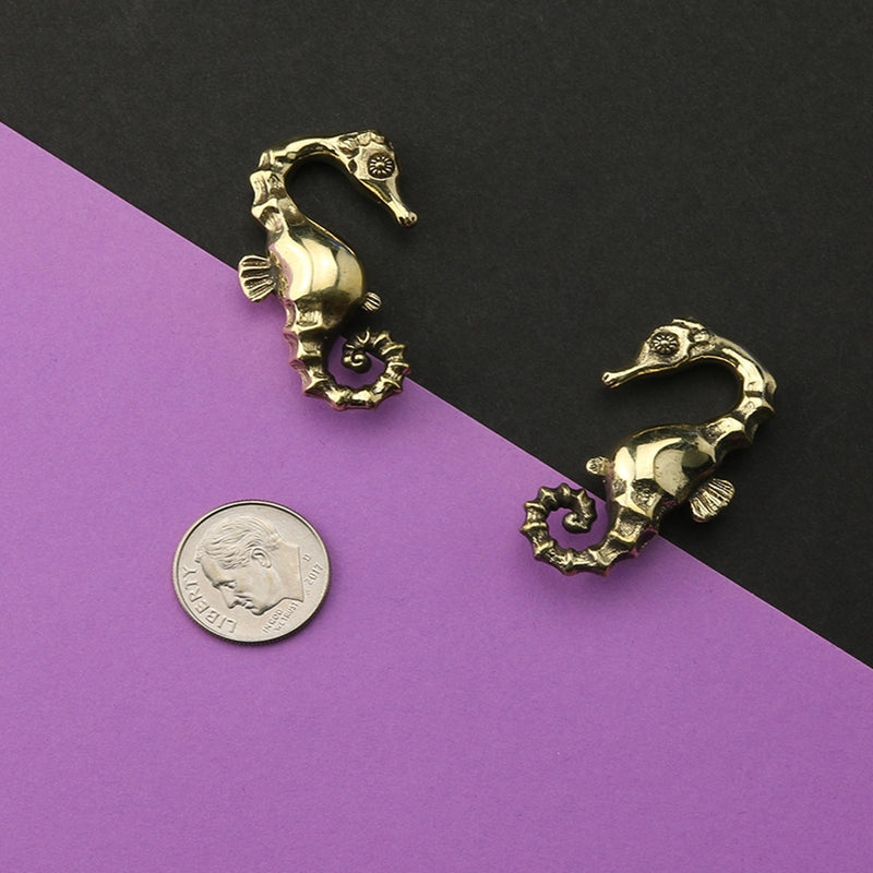 Seahorse Ear Weights are two brass weights meant for healed piercings larger than 6G. Each weight measures 36mm in height and 18mm in width, and weighs 14 grams, making it ideal for those who want show off a unique style. Brass is not meant for long term wear and may oxidize under extreme moisture conditions.