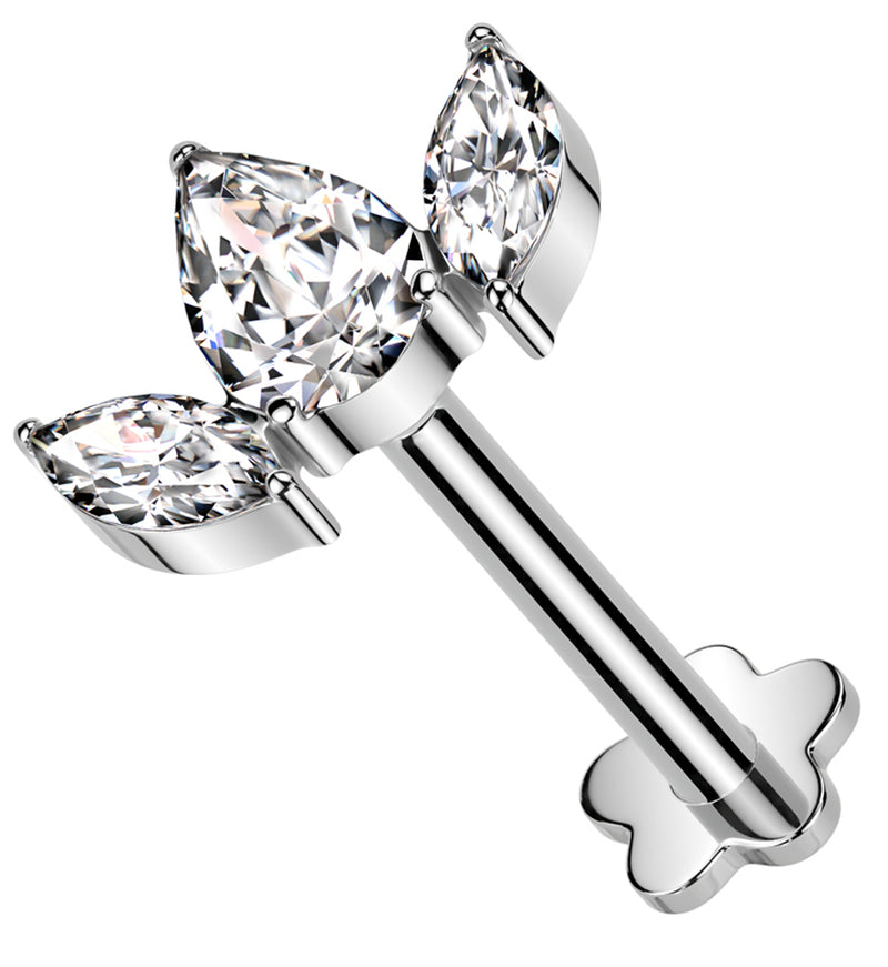 Made from high-quality ASTM F-136 titanium, this titanium threadless labret has a triple teardrop arched design on top. The design measures about 8mm x 6mm. It is made from strong ASTM F-136 titanium and has a 25G pin and a 4mm flower shaped, flat back. Sold individually, it is available in size 18G or 16G with a 5/16" (8mm) wearable length. Sparkling labret piece for cartilage or tragus piercings!