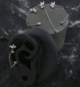 Connecting, dangling chain threadless top pieces, one end with a 3.5mm bezel set clear cz gem and the other end has triple marquise clear cz gem design complete with a dangling 3.5mm clear cz gem. Made from ASTM F-136 titanium. Full length including chain measures about 53mm long. 25G pins. Fits most threadless posts. Sold individually (top piece only).