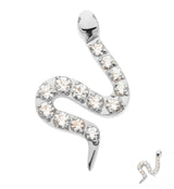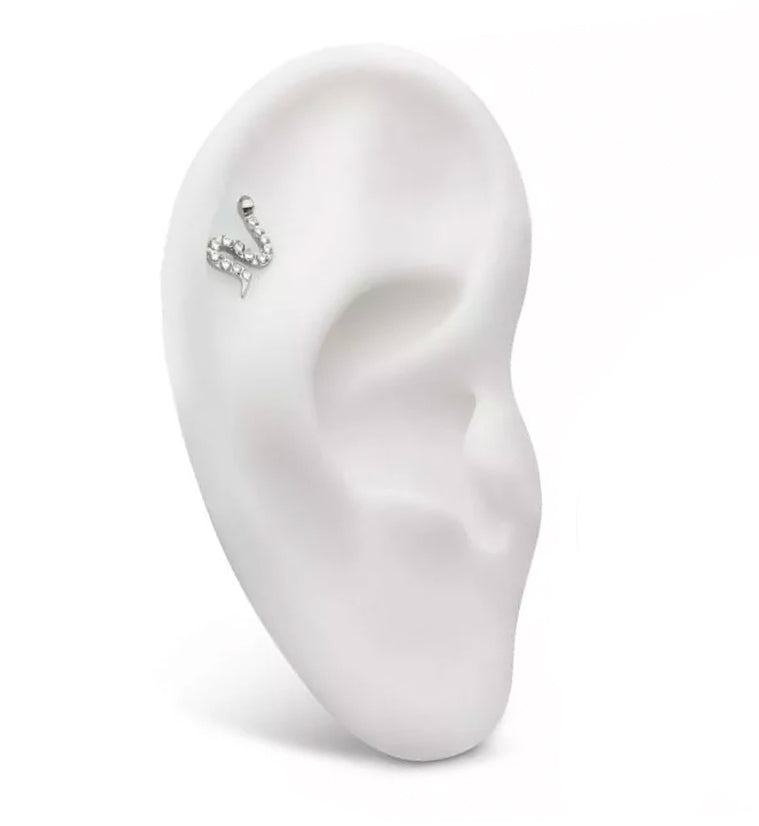 Threadless top piece with a snake design filled with clear cubic zirconia gems. Made from ASTM F-136 titanium. Top size is 12mm x 6mm. Will fit most threadless posts. 25G pin. Sold individually (top piece only).