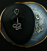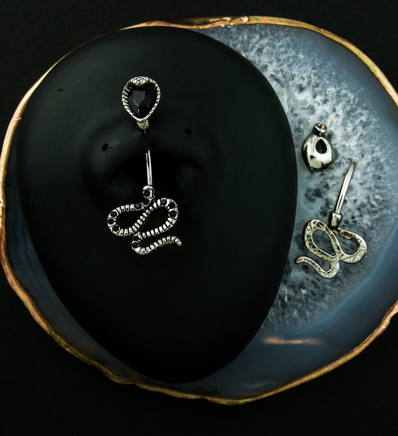 Externally threaded, belly button ring made from 316L stainless steel and black cz gems. The design is a snake that goes through your navel. The head is made from a 9mm teardrop black cz gem and the bottom tail design measures at 14mm x 14mm and is accented with black cz gems. Size is 14G with a 3/8" (10mm) length. Sold individually (1pc). For healed piercings.