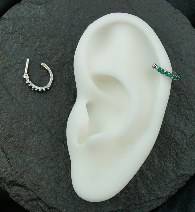 Hinged segment ring made from surgical 316L stainless steel with a d-shaped hoop shape and a side-facing row of six, emerald green, prong-set, cubic zirconia gems around the rim. Size is 16G with an inner diameter size of 1/4" (6mm). The hinged design makes this piece effortless to insert and take out. Sold individually (1pc).