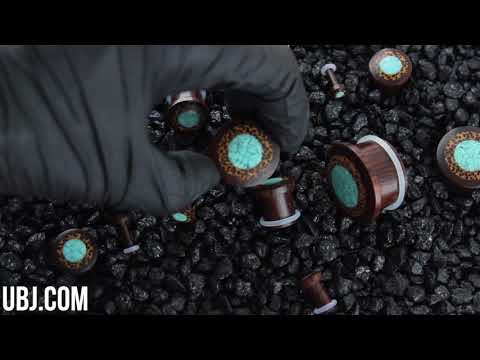 Featuring striking coconut & turquoise inlays, these single flared dark tamarind wood plugs are available in sizes 8G-1 Inch, with a comfortable 9mm-10mm wearable area. Each plug is one-of-a-kind with its unique design and pattern. Keep them secure with the included clear silicone "O" rings. Great for healed piercings. Sold in pairs.