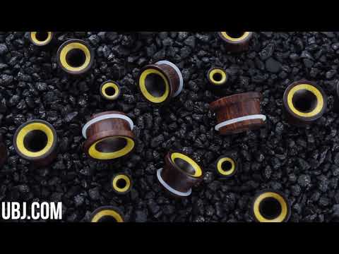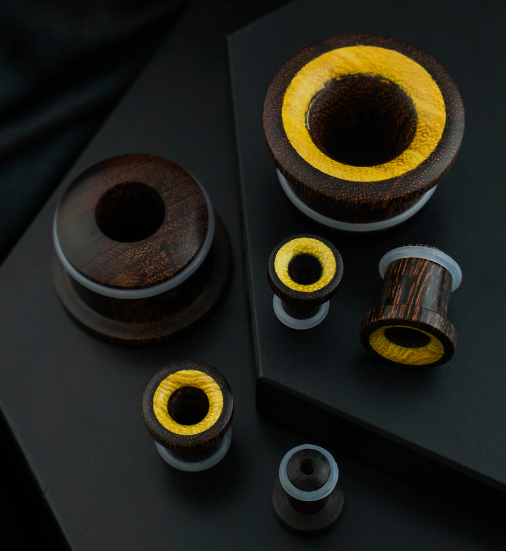 Single flare dark tamarind wood tunnels with a jackfruit inlay. These tunnels are sold in pairs and allow you to pick from 2G (6mm) to 1 inch (25mm) sizes. Made from dark tamarind wood with a jackfruit wood inlay, they feature a single flare and concave design with a 9mm-10mm wearable surface. The clear silicone "O" rings and groove provide comfortable wear for healed piercings. Please note, these tunnels are not to be used for stretching.