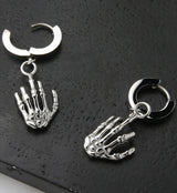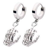 Huggie earrings with a dangling skeleton hand attached. Made from 316 stainless steel. Size is 18G. Diameter is 1/2" (13mm). Total length is approximately 35mm. The hinged design is easy to open and close. Sold in pairs (2 pieces).