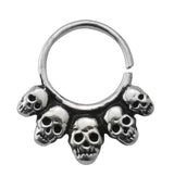 White brass hoop ring with a line of skulls along the bottom. Can be worn as septum or cartilage jewelry. The annealed (bendable) design makes for easy insertion and removal. Size is 18G. Inner diameter is 3/8" (10mm). Sold individually (1pc). For healed piercings.