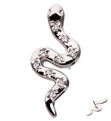 This titanium threadless top features slithering snake design that has nine, prong-set, clear cz gems throughout. This piece is made from ASTM F-136 titanium and fits most threadless posts. Pin size is 25G. The top design measures 14mm x 6mm. Sold individually (1pc - top only).