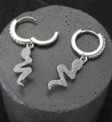 Hoop-style earrings with a dangling snake attached that is filled with clear cz gems. Hinged clasp is made from 316L stainless steel and the snake design is made from brass. Size is 18G. Diameter is 3/8" (10mm). Total length is approximately 36mm. The hinged design is easy to open and close. Sold in pairs (2 pieces).