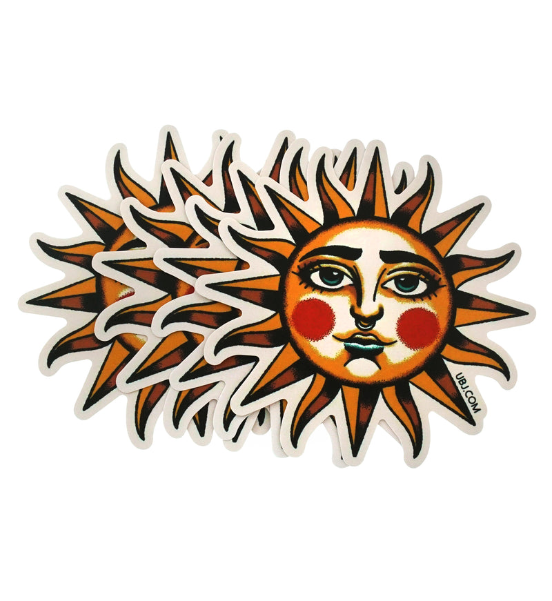 American traditional tattoo artwork of a sun with a face on it. Peel off backs with matte lamination. Add to your water bottle, laptop, skateboard, wherever! Size is about 76mm in diameter.