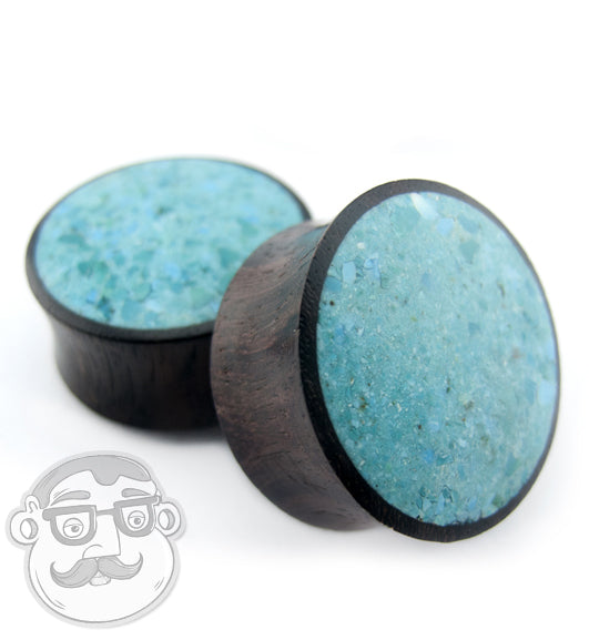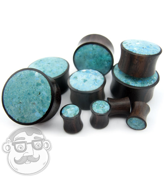 Get a unique look with our Areng Wood Plugs featuring a stunning synthetic turquoise stone inlay. Sold in pairs, these double flared plugs are perfect for healed lobes and come in a variety of wearable areas, ranging from 8G (3mm) to 1 & 1/2" (38mm). Keep out of water.