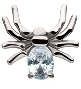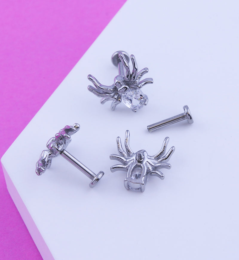 This Spider Clear CZ Stainless Steel Internally Threaded Labret is a fun choice for accessorizing a cartilage or ear piercing. It's sold individually and is made from 316L stainless steel with a flat back size of 3mm and design size of 10mm x 8mm. The labret is 18G and ¼" (6mm) in length, with a clear CZ gem and internally threaded.