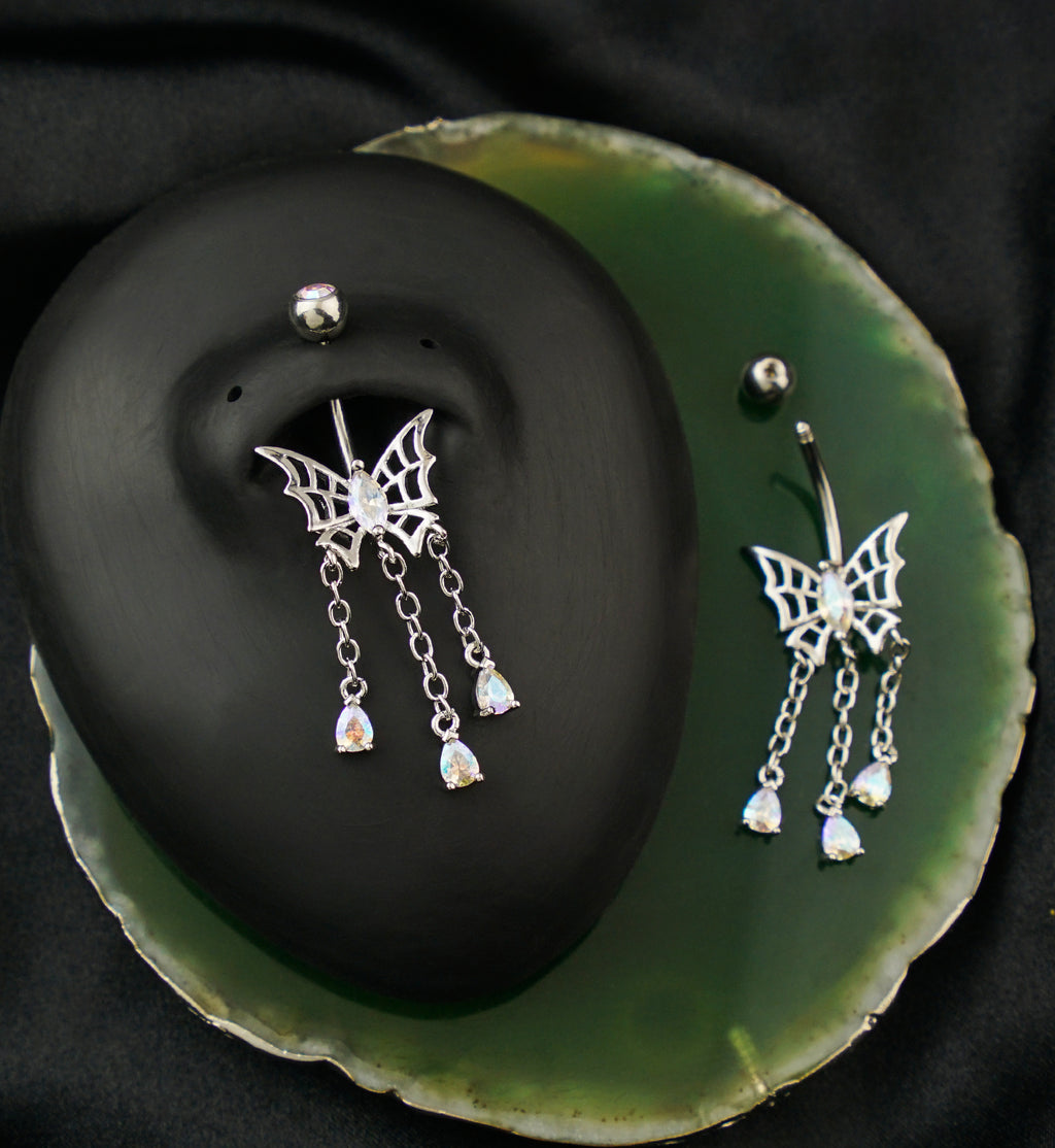 Spiderweb Butterfly Teardrop Rainbow Aurora CZ Dangle Stainless Steel Belly Button Ring