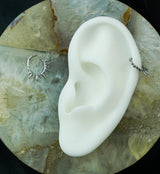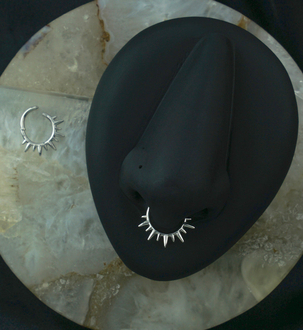 Hinged segment ring that is decorated with multiple spikes. Made with 316L stainless steel, this 16G ring features a hinged segment for easy opening and closing. Perfect for septum piercings, this ring is sold individually and comes in an inner diameter size of 5/16" (8mm).